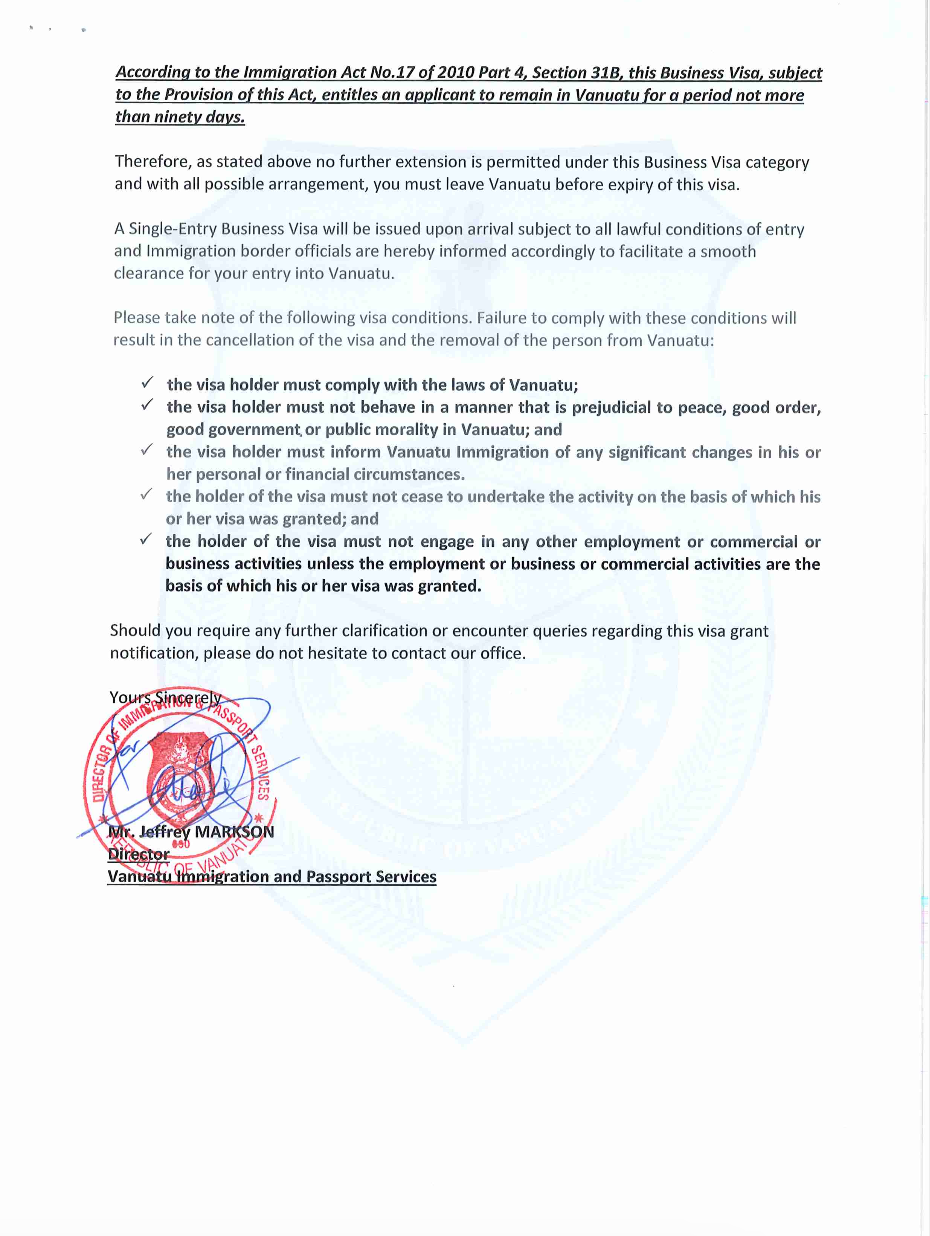 注意点:事前にバヌアツの在外公館や現地の移民局に最新の要件を確認することをお勧めします。時に突然変更になります。実は私はほぼ特例