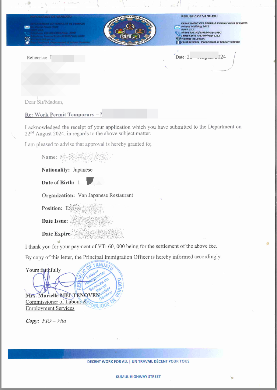 - バヌアツでの正式な就労証明となる