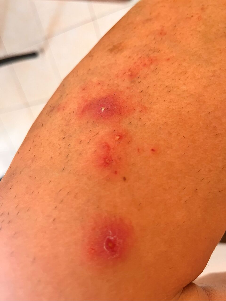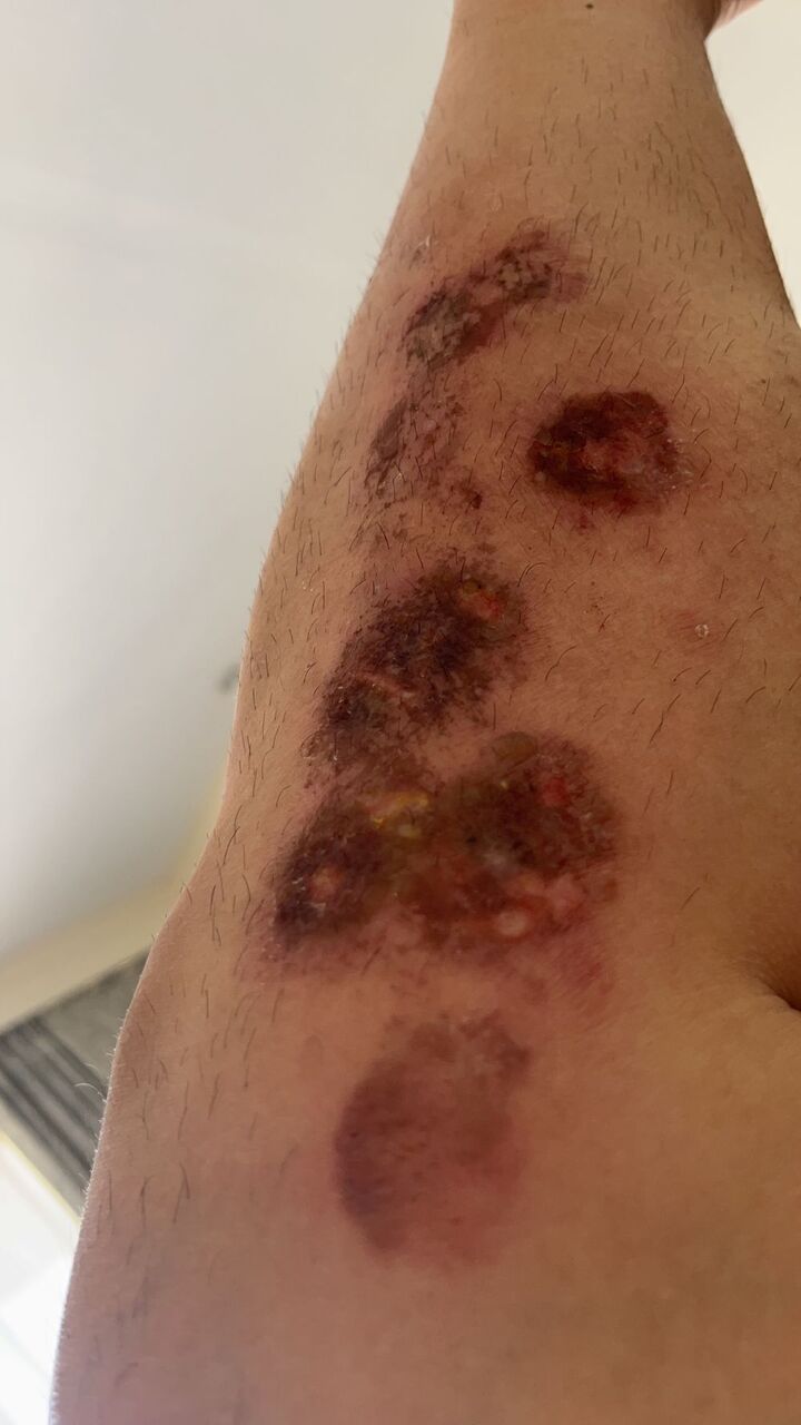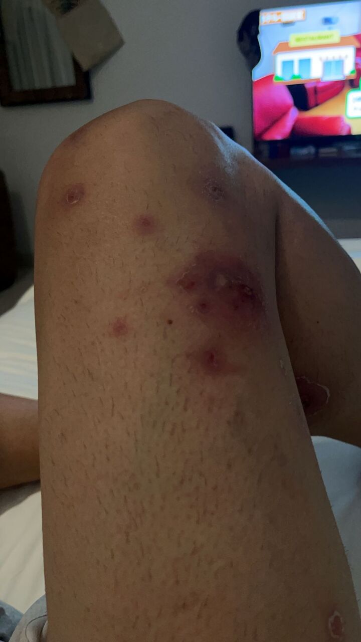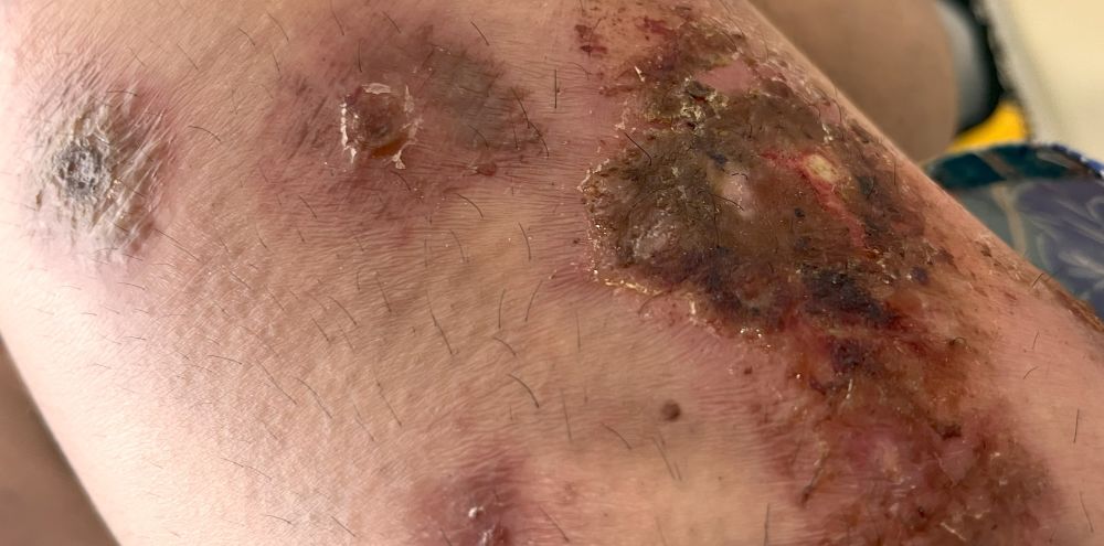 なんとなく膿が減ってきてる。水ぶくれは無くならないがカサブタが剝がれてきている部分もある