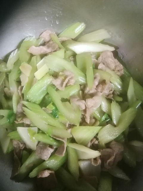 先に豚肉とセロリーだけ炒めときます。塩で軽く下味