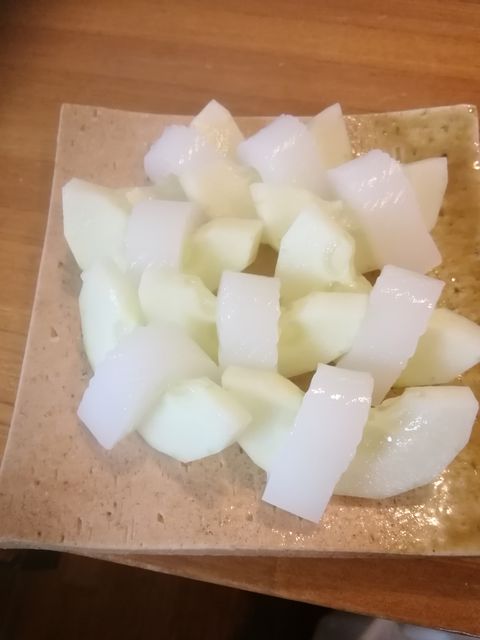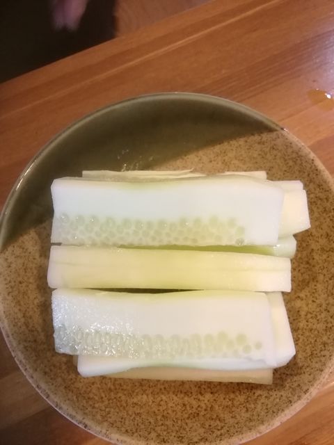 これは柵を取ったアオリイカに紙塩(半紙を被せてその上に振り塩をする)をいう過程をしてます。約40分ほどですかね。加賀太胡瓜は昆布塩に漬けて3時間程置きました。それを切って一緒に頂くだけです。見た目まんまに見えますがしっかり味がします。塩は勿論天然塩です