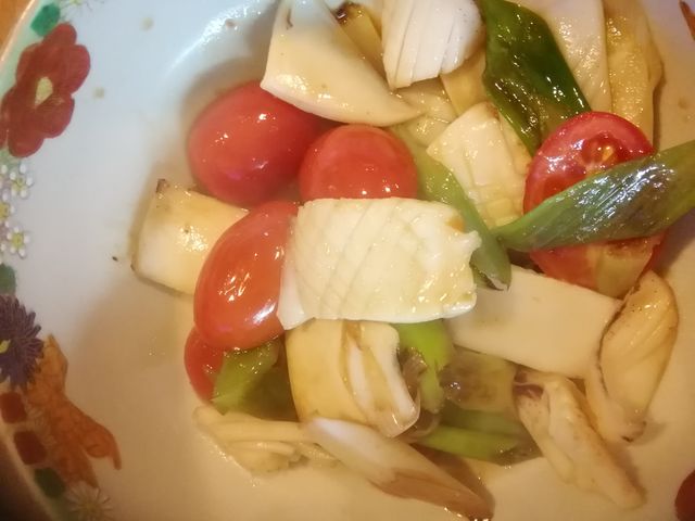 大層な料理でもないんですけどアオリイカのエンペラとかゲソとかを油で炒めて酒・醤油で薄く味付けただけです。新玉ねぎいいかなと思ったら使い切ってたので長ネギ入れちゃいました。けど美味しかった。トマトはコレも近所から頂いた栽培ものですけどwヤッパ甘さが違いますね